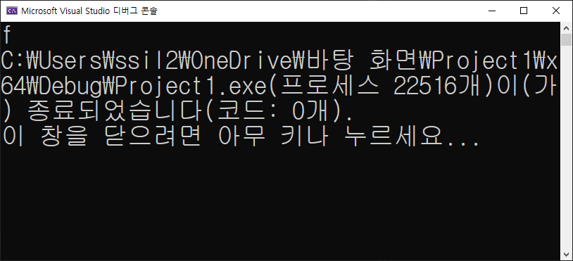 실수 자료형 변수 a에 저장된 'f' 라는 문자가 화면에 잘 출력된 것을 확인할 수 있습니다.