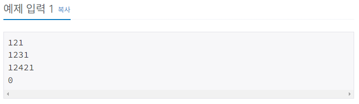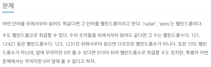 수도 팰린드롬으로 취급할 수 있다. 수의 숫자들을 뒤에서부터 읽어도 같다면 그 수는 팰린드롬수다. 121, 12421 등은 팰린드롬수다. 123, 1231은 뒤에서부터 읽으면 다르므로 팰린드롬수가 아니다. 또한 10도 팰린드롬수가 아닌데, 앞에 무의미한 0이 올 수 있다면 010이 되어 팰린드롬수로 취급할 수도 있지만, 특별히 이번 문제에서는 무의미한 0이 앞에 올 수 없다고 하자.