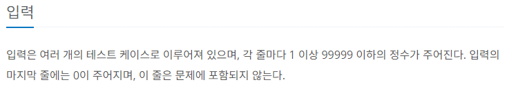 입력은 여러 개의 테스트 케이스로 이루어져 있으며, 각 줄마다 1 이상 99999 이하의 정수가 주어진다. 입력의 마지막 줄에는 0이 주어지며, 이 줄은 문제에 포함되지 않는다.