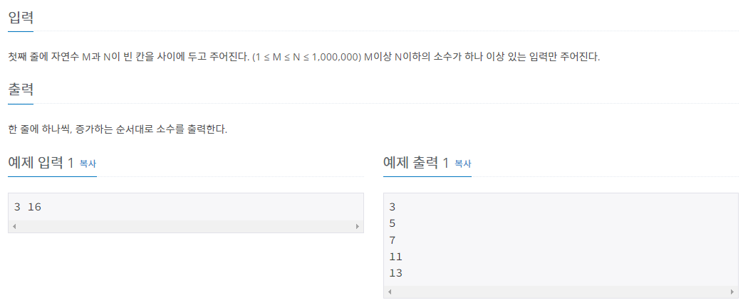 첫째 줄에 자연수 M과 N이 빈 칸을 사이에 두고 주어진다. (1 ≤ M ≤ N ≤ 1,000,000) M이상 N이하의 소수가 하나 이상 있는 입력만 주어진다.