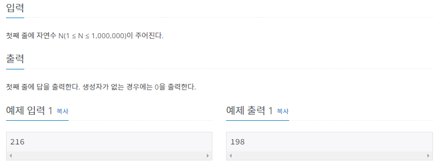 어떤 자연수 N이 있을 때, 그 자연수 N의 분해합은 N과 N을 이루는 각 자리수의 합을 의미한다. 어떤 자연수 M의 분해합이 N인 경우, M을 N의 생성자라 한다. 예를 들어, 245의 분해합은 256(=245+2+4+5)이 된다. 따라서 245는 256의 생성자가 된다. 물론, 어떤 자연수의 경우에는 생성자가 없을 수도 있다. 반대로, 생성자가 여러 개인 자연수도 있을 수 있다.