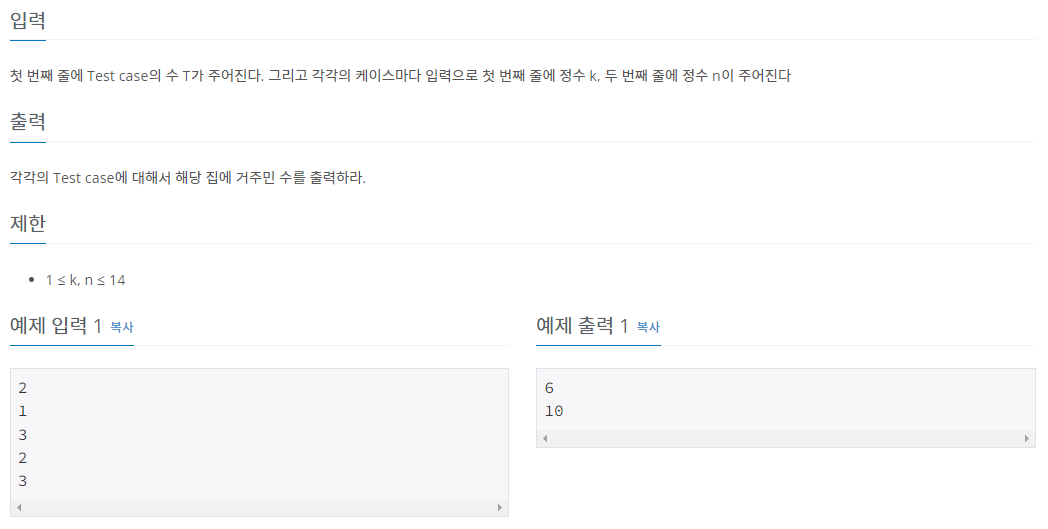 아파트에 비어있는 집은 없고 모든 거주민들이 이 계약 조건을 지키고 왔다고 가정했을 때, 주어지는 양의 정수 k와 n에 대해 k층에 n호에는 몇 명이 살고 있는지 출력하라. 단, 아파트에는 0층부터 있고 각층에는 1호부터 있으며, 0층의 i호에는 i명이 산다.