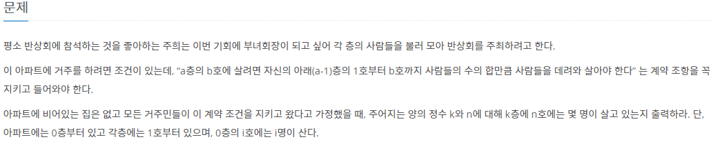 이 아파트에 거주를 하려면 조건이 있는데, “a층의 b호에 살려면 자신의 아래(a-1)층의 1호부터 b호까지 사람들의 수의 합만큼 사람들을 데려와 살아야 한다” 는 계약 조항을 꼭 지키고 들어와야 한다.
