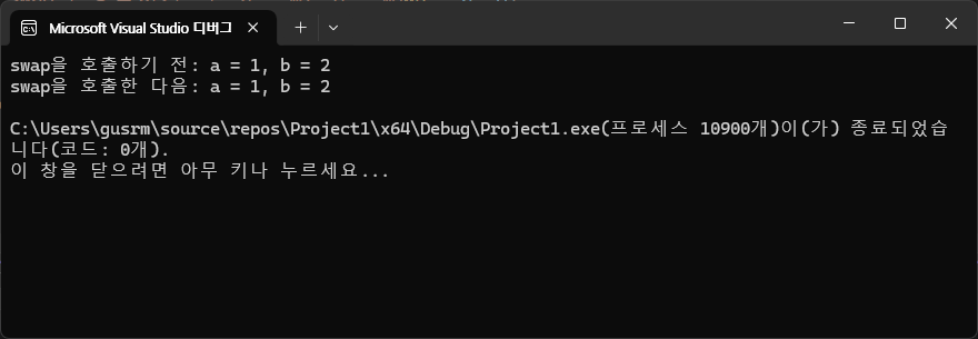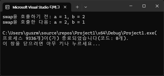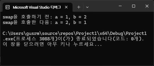 printf("swap을 호출한 다음: a = %d, b = %d\n", a, b);