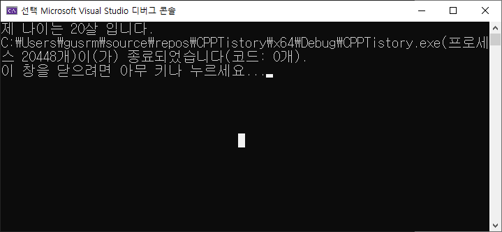 화면에는 "제 나이는 20살 입니다"를 출력하려면 다음과 같은 코드를 써줘야합니다.
