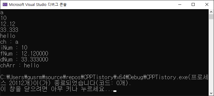 이제 사용자로부터 각 자료형의 변수들을 입력받고 출력해보는 간단한 프로그램을 살펴보겠습니다.