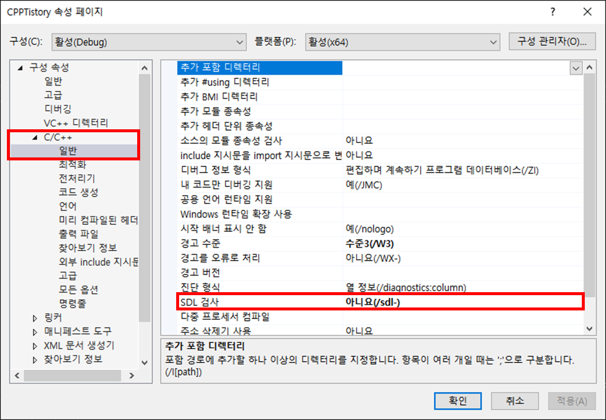1. 프로젝트 -> 속성 -> C/C++ -> SDL 검사 -> 아니오