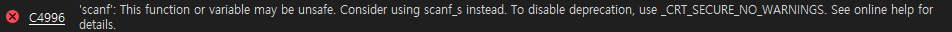 비주얼 스튜디오에서 scanf() 함수를 사용하면 안전하지 않다는 오류가 나온다