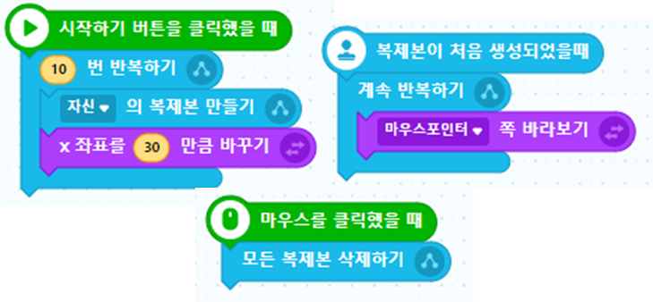 이 코드 블록들을 이용하면 오브젝트를 복제하고 복제할 때 어떤 코드들을 실행할지 결정할 수 있습니다.