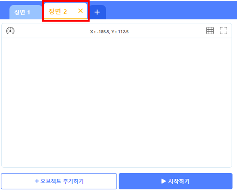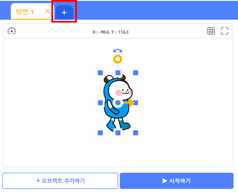새로운 장면을 추가하는 방법은 엔트리 실행화면 바로 위에 장면을 더할 수 있는 버튼이 있습니다. 이 버튼을 클릭하면 새로운 장면을 추가할 수 있습니다.