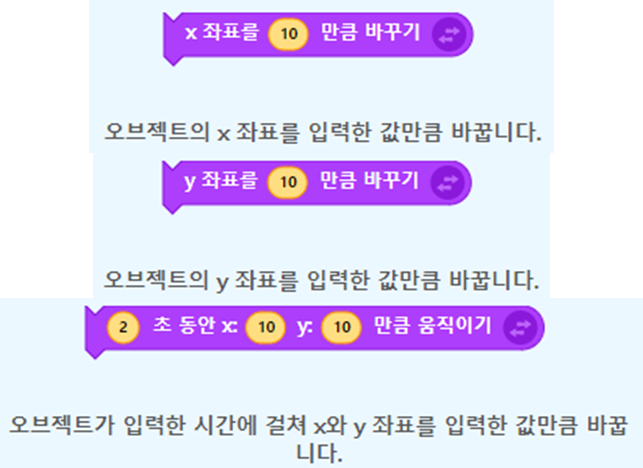 좌표 관련 코드 중 위의 세가지 코드는 오브젝트의 현재 위치를 기준으로 좌표를 변경하는 코드 블록입니다.