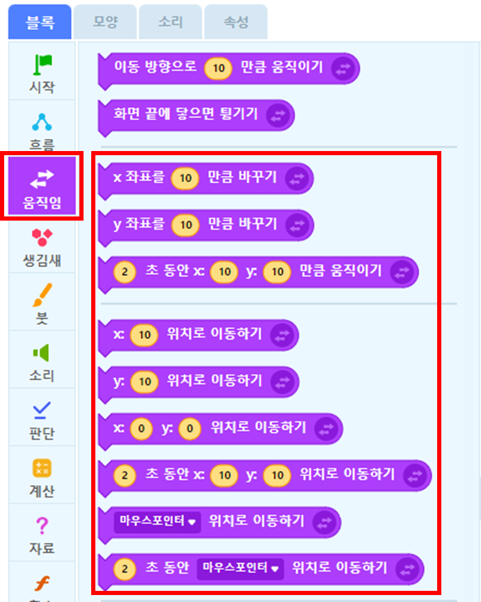 좌표에 관련된 코드 블록들은 움직임 코드 블록 안에 있습니다.
