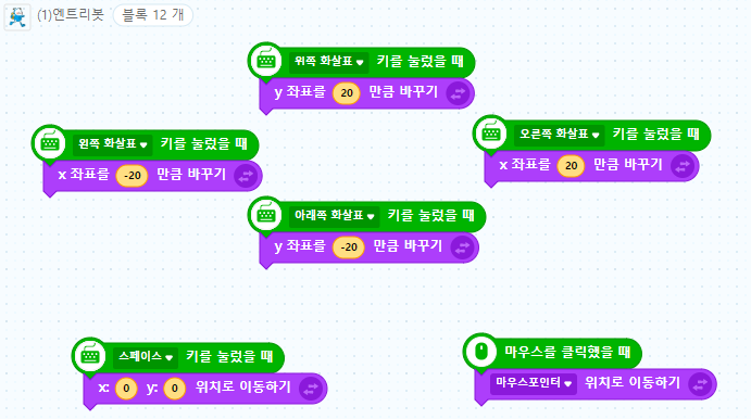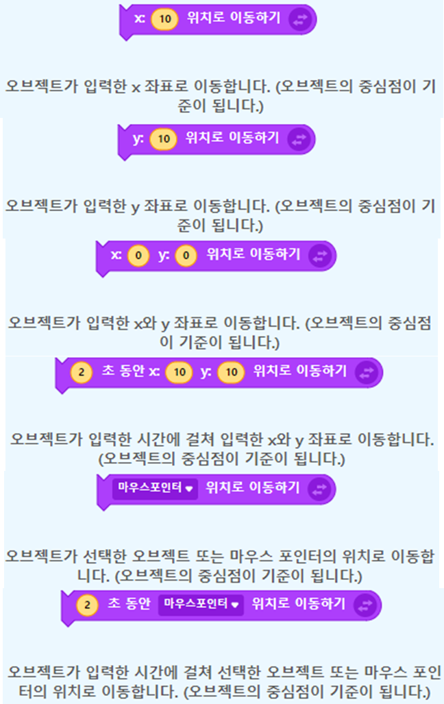 위의 5개 코드는 특정한 좌표로 오브젝트를 이동하는 코드 블록이다.