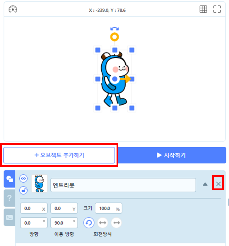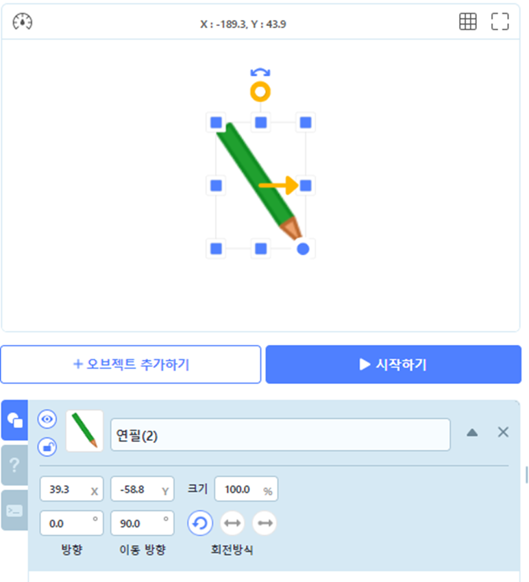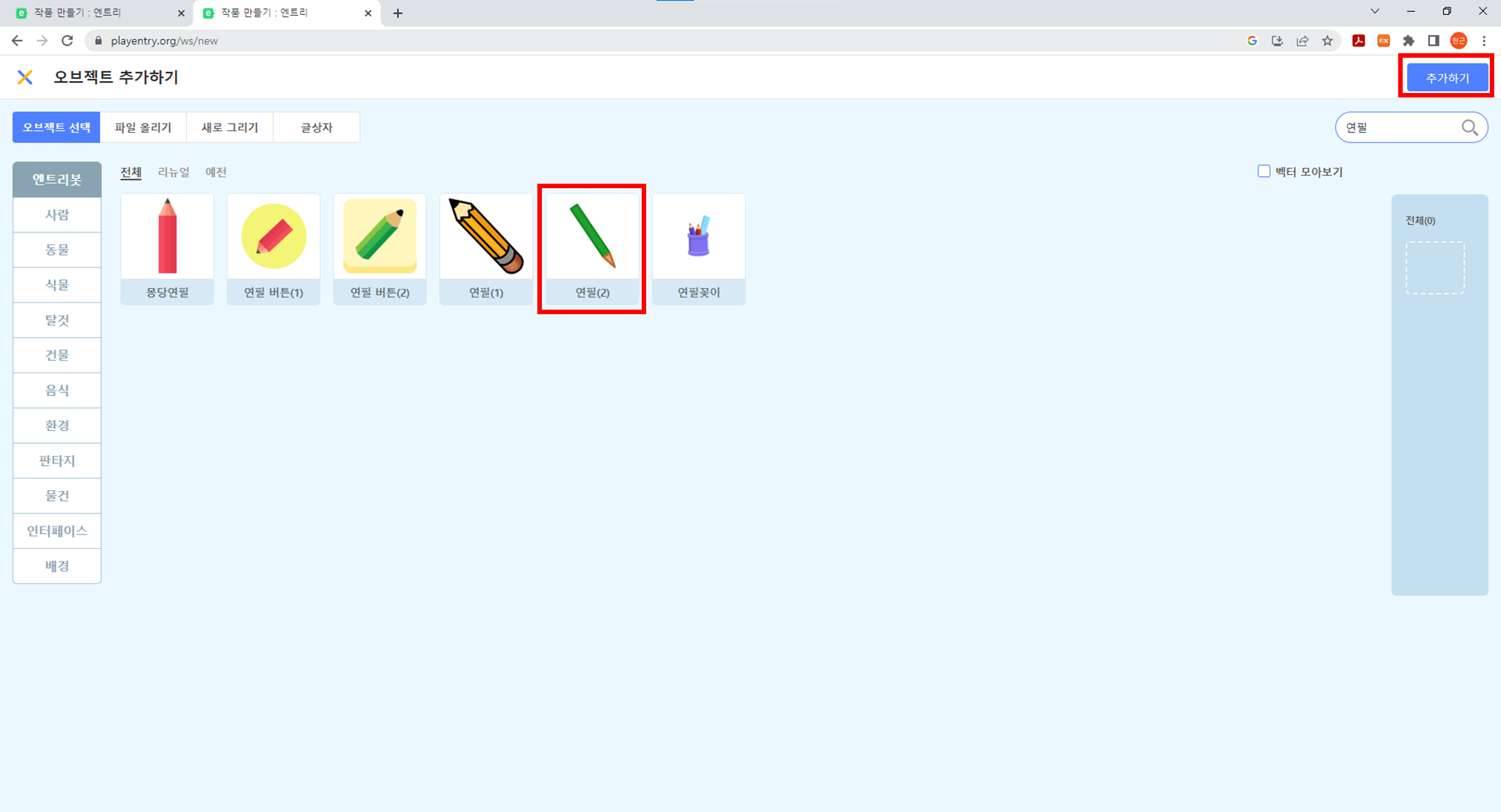 먼저 기존에 추가되어 있는 엔트리봇 오브젝트를 없앤 후 연필 오브젝트를 추가해줍니다.