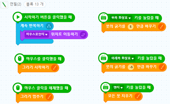붓 관련 코드를 이용하면 손쉽게 엔트리를 이용하여 그림판을 만들 수 있습니다.