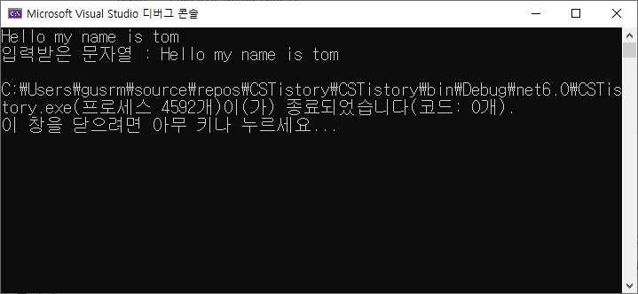 사용자가 입력을 완료(Enter를 누르면)하면 Console.ReadLine() 메서드의 반환값은 사용자의 입력값이 되어 input에 저장됩니다.