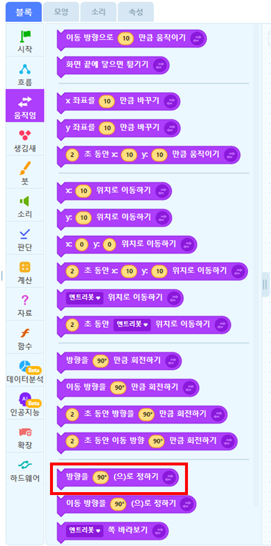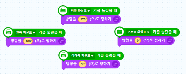 화살표 입력을 받아서 엔트리봇의 방향을 바꿔주는 코드는 위 그림과 같습니다.
