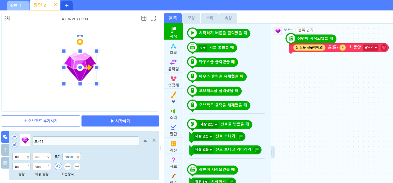 장면 2에 보석 오브젝트를 추가해줍니다.