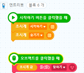 엔트리봇 오브젝트를 클릭하면 현재 초시계값을 말하도록 프로그램을 만들어보겠습니다.