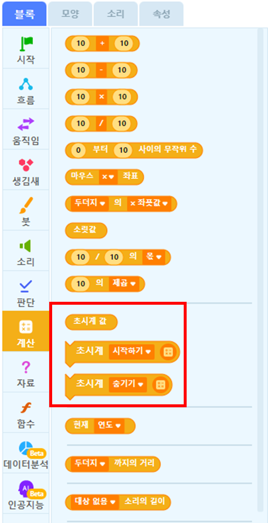 초시계 코드 블록은 계산 코드 블록에 있습니다.