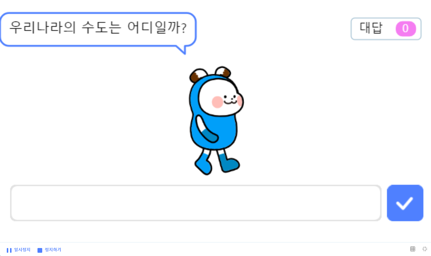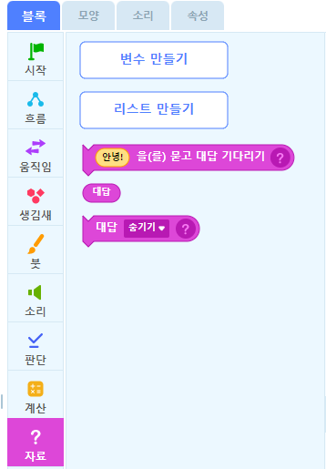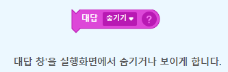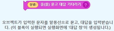 이 대답 창에 사용자가 입력한 값이 위에서 살펴본 "대답" 코드 블록에 저장이 됩니다.