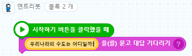 엔트리봇이 "우리나라의 수도는 어디일까?" 를 물어보고 기다린 후에