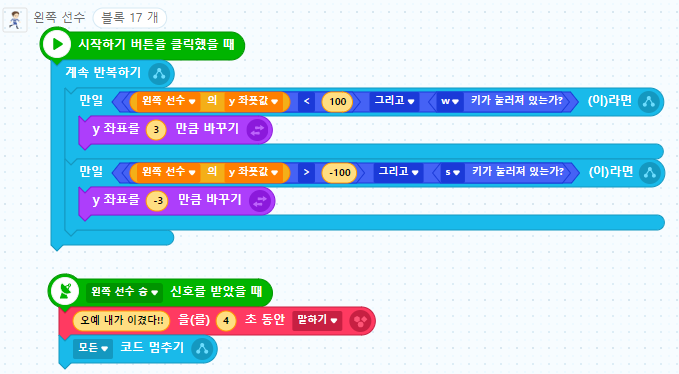 왼쪽 선수는 w 키가 눌러져 있고, y 좌표값이 100 이하면 y 좌표를 3만큼 움직입니다. (y 좌표값이 100 이하여야 하는 이유는 화면 위로 안 나가게 하기 위함입니다.)