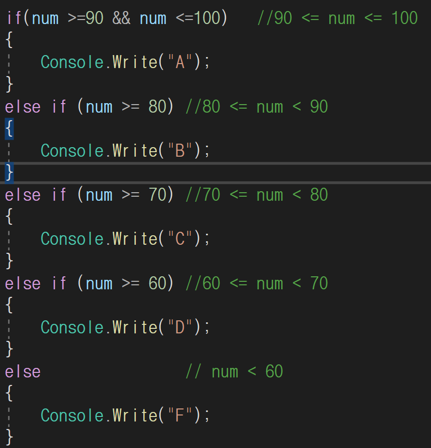 시험 점수를 입력받아 90 ~ 100점은 A, 80 ~ 89점은 B, 70 ~ 79점은 C, 60 ~ 69점은 D, 나머지 점수는 F를 출력하는 프로그램을 작성하시오.