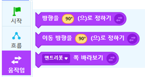 "마우스포인터 쪽 바라보기" 코드 블럭과 "방향을 __으로 정하기" 코드 블럭은 움직임 코드블럭에 있습니다.