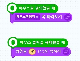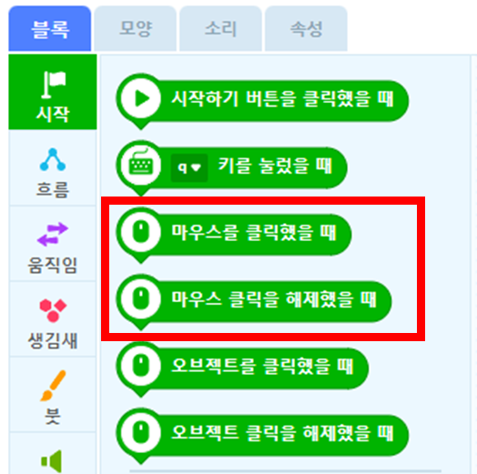 위 그림과 같이 시작 코드블럭이 모인 곳에서 상단에 "마우스를 클릭했을 때" 코드 블럭과 "마우스 클릭을 해제했을 때" 코드 블럭이 있습니다.