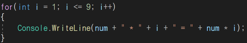 Console.WriteLine(num + " * " + i + " = " + num * i);