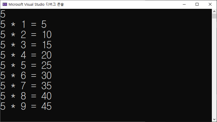 사용자가 5를 입력하면 구구단 5단이 출력되는 것을 확인할 수 있습니다.