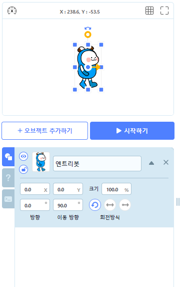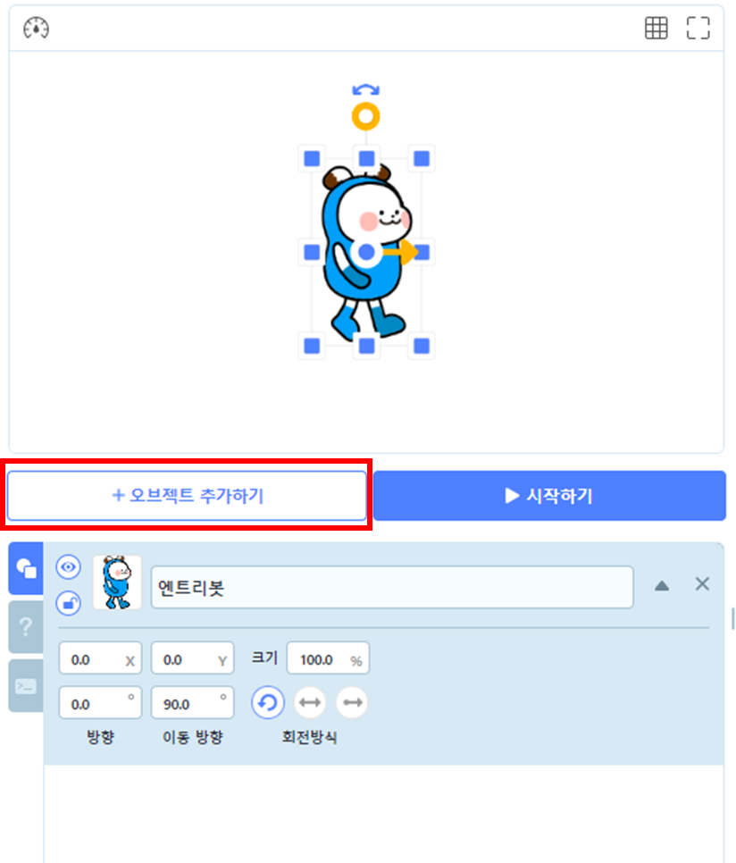 엔트리 기본 화면에서는 기본적으로 엔트리봇 오브젝트 하나가 추가되어 있습니다.