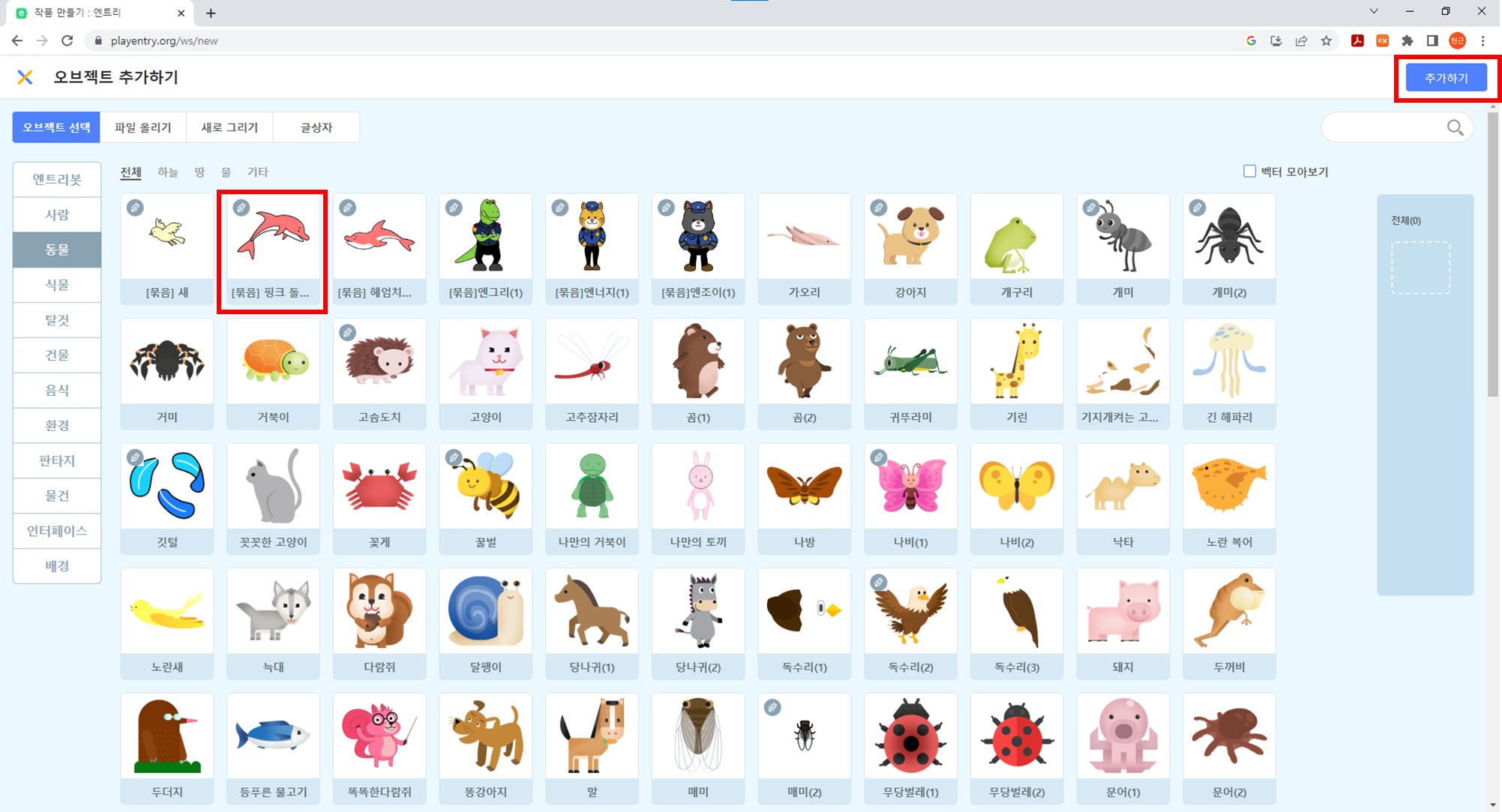 동물 오브젝트들 중 핑크 돌고래를 클릭하고 우측 상단에 있는 추가하기 버튼을 클릭하면 현재 프로그램에 핑크 돌고래 오브젝트를 추가할 수 있습니다.