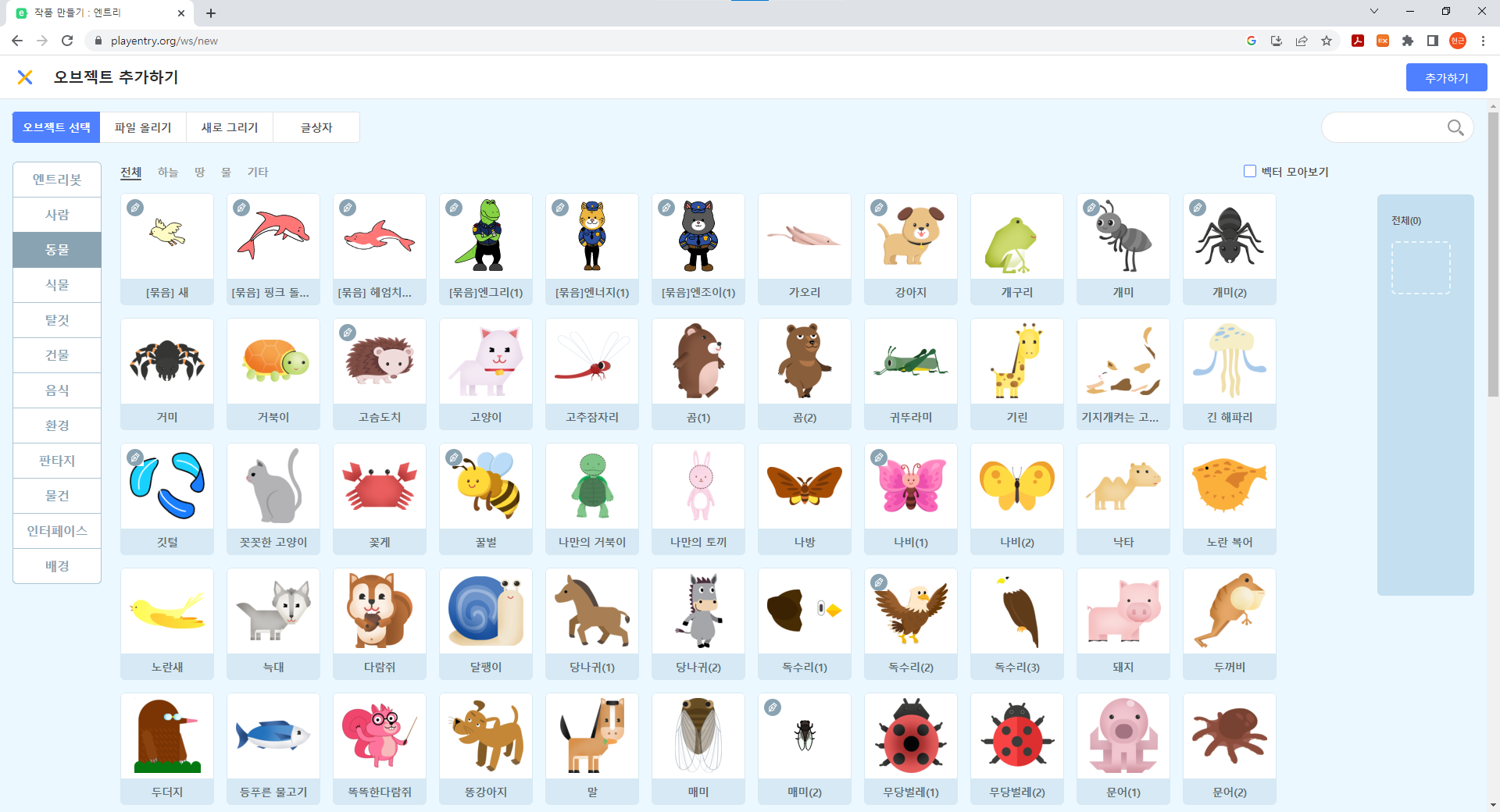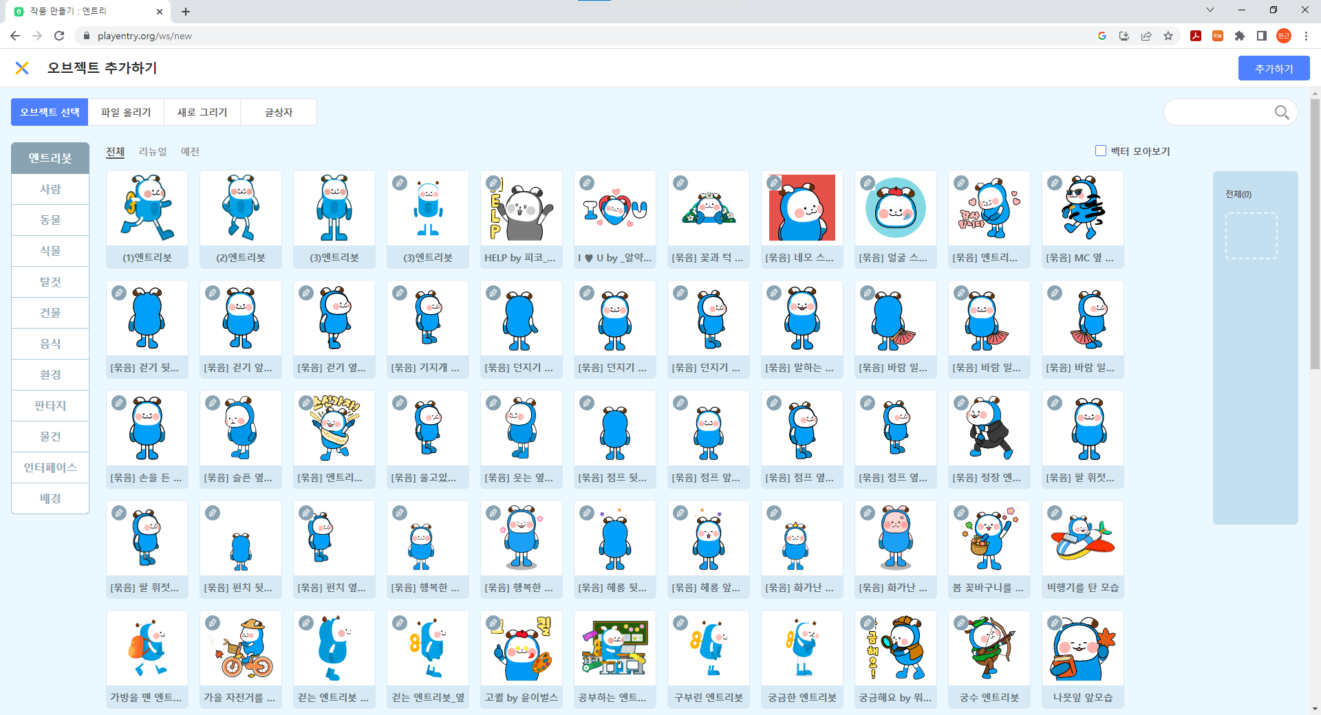 이 버튼을 클릭하면 엔트리에서 제공하는 다양한 오브젝트를 사용할 수 있습니다.