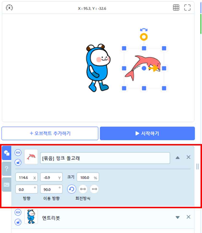 추가하기 버튼을 누르면 핑크 돌고래 오브젝트가 프로그램에 추가된 것을 확인할 수 있습니다.