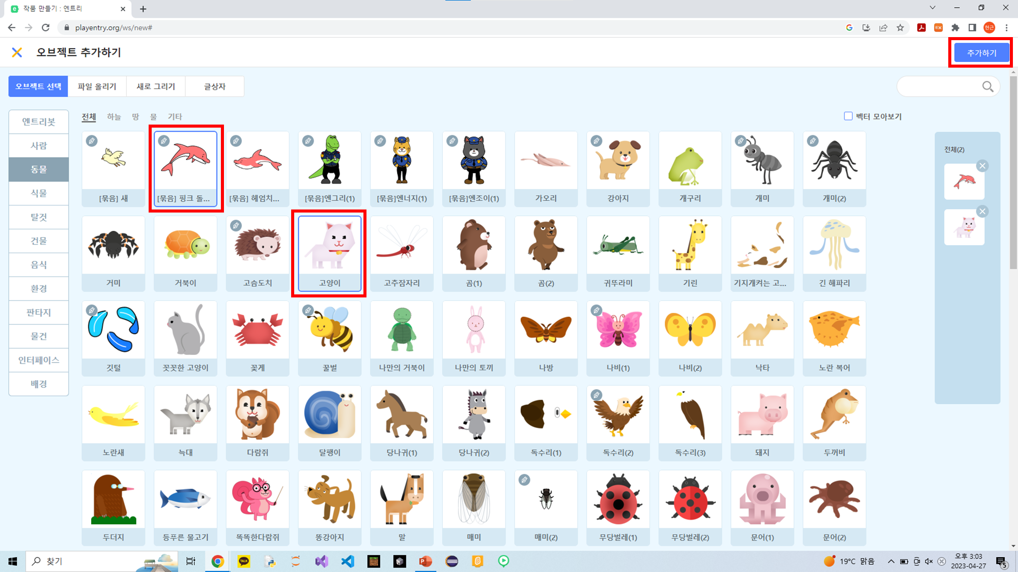 핑크 돌고래와 고양이 오브젝트가 추가된 것을 확인할 수 있습니다.