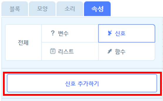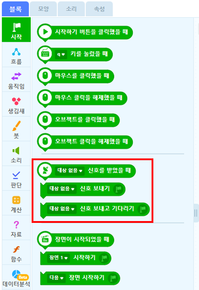 위의 그림과 같이 엔트리에서는 신호를 처리하는 코드블럭들을 제공합니다.