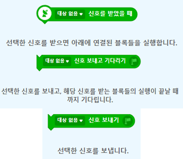 - __신호 보내고 기다리기 코드 블럭 : 신호를 보낸 후 신호를 받은 블록들의 실행이 끝날 때까지 기다립니다.